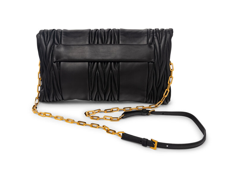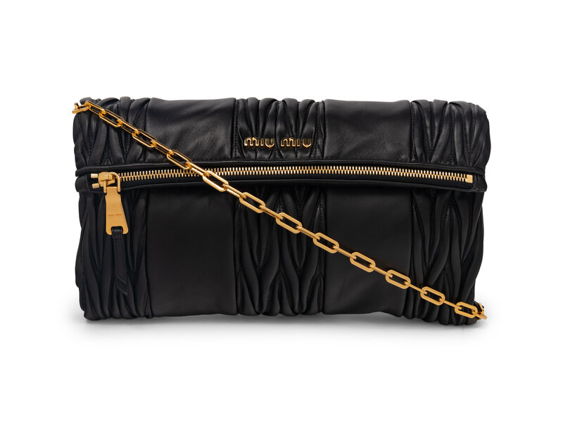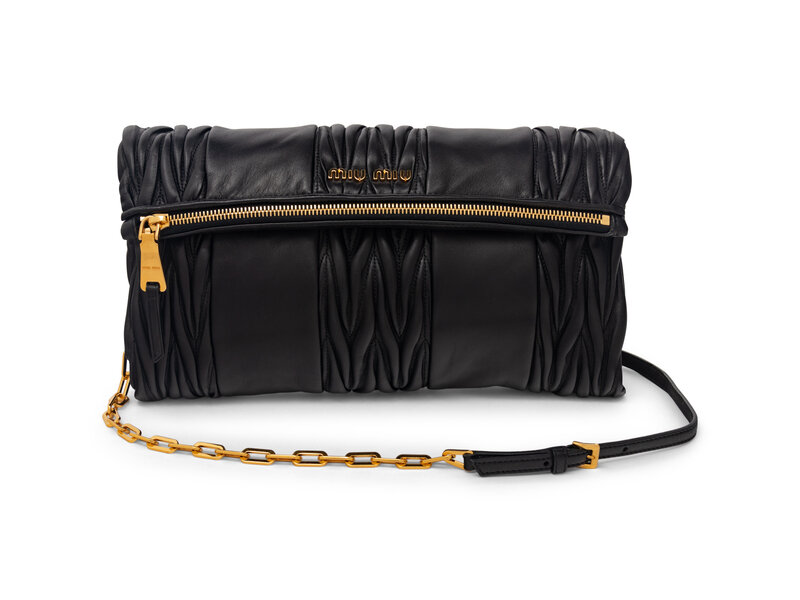 Miu Miu Large Fold-Over Zip Clutch in Pleated Black Lambskin Leather with Gold-Tone Hardware.
