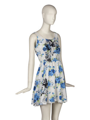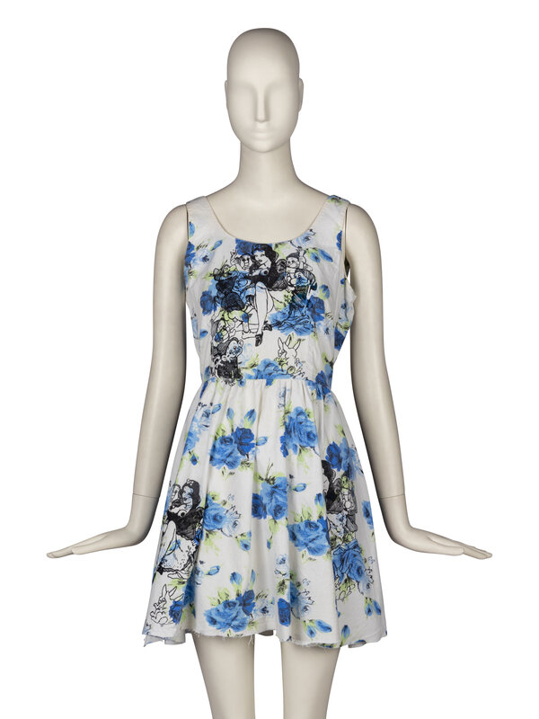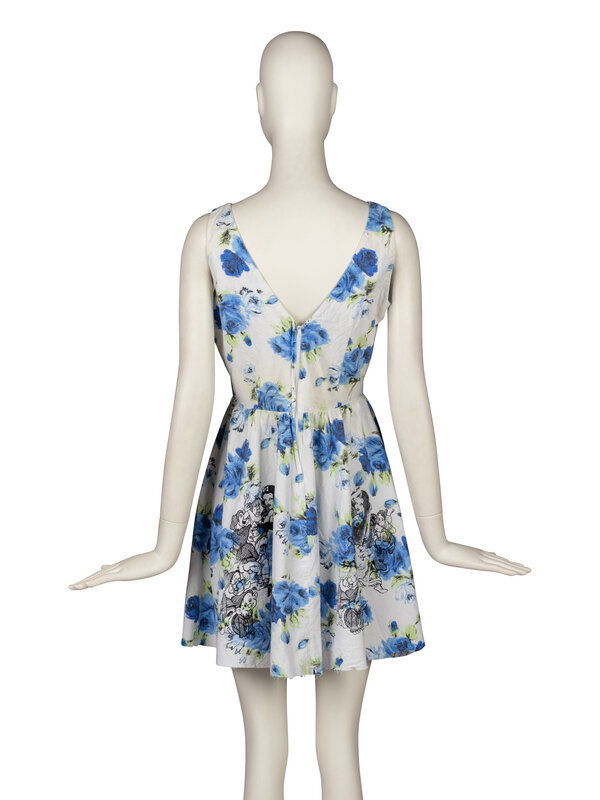 Sleeveless cotton mini dress in blue floral print. Silkscreened with suggestive Snow White and the Seven Dwarves illustration. Shortened, with the bottom hem left unfinished. Zip closure at back.