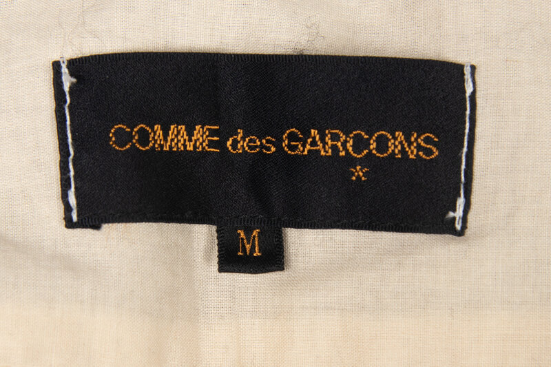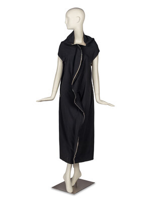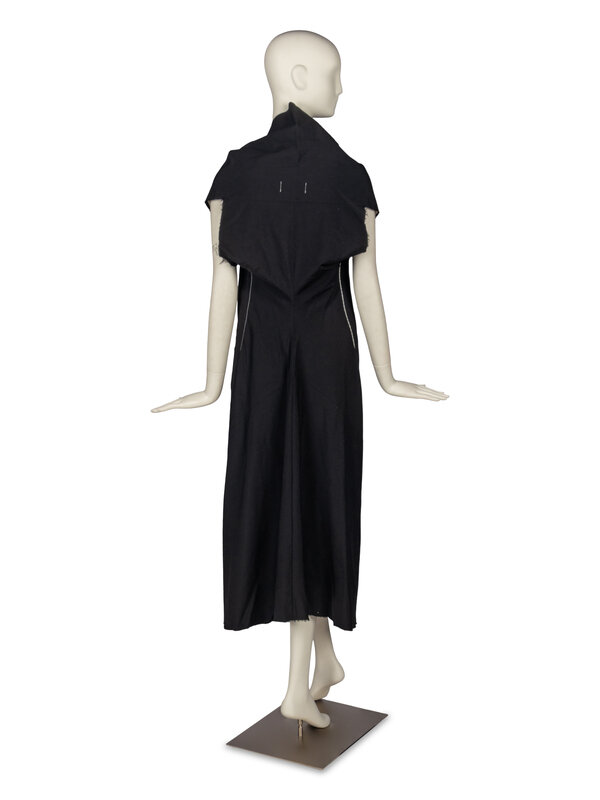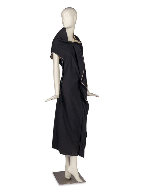Sleeveless gown in black muslin wool with white cotton lining and accents. Raw edges throughout. Features untrimmed seam allowances. From the Spring/Summer 1998 "Clustering Beauty" collection.