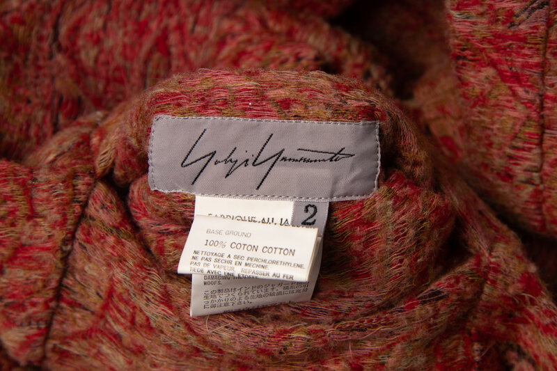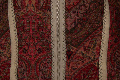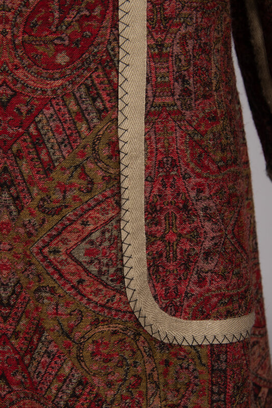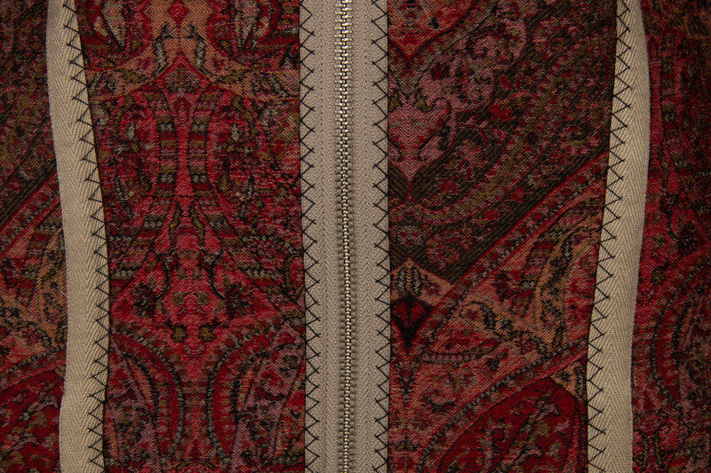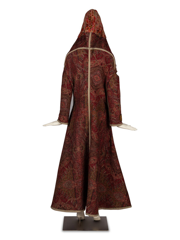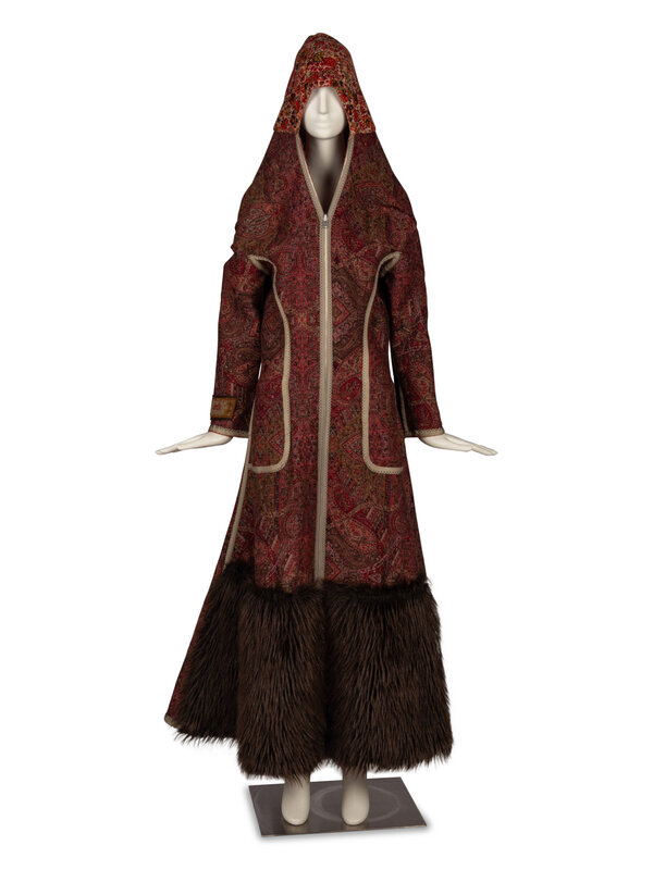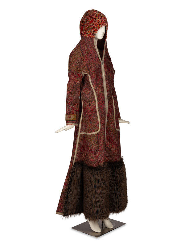 Full-length coat in multicolor wool-blend jacquard with faux fur trim. Hood with velvet accents. Two-way front zip closure. Unlined.