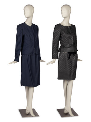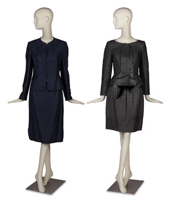 A-line skirt in quilted grey lambskin leather with small pleats just below the waistband. Features a full-lining and velvet bow embellishment at center front.