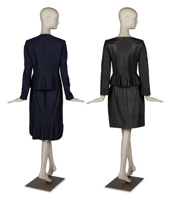 Collarless jacket in quilted grey lambskin leather with small pleats at waist. Jacket features leather-covered buttons at center front and is fully-lined.