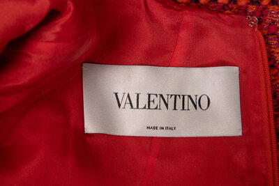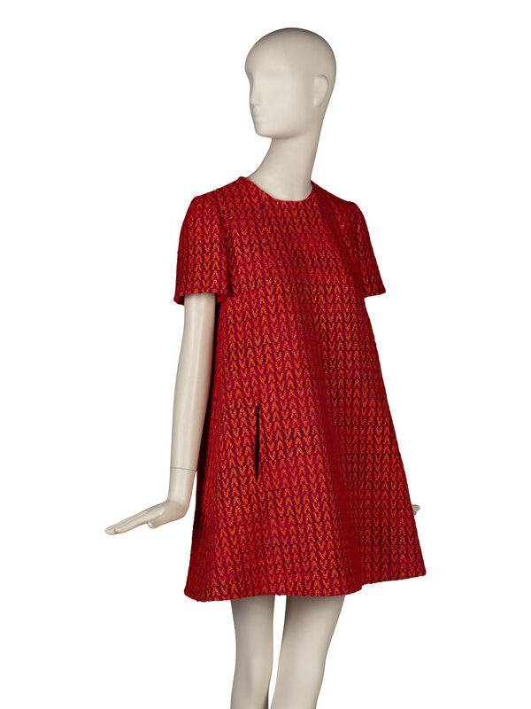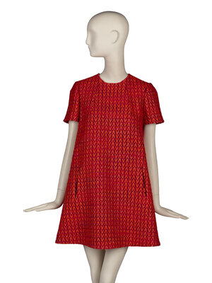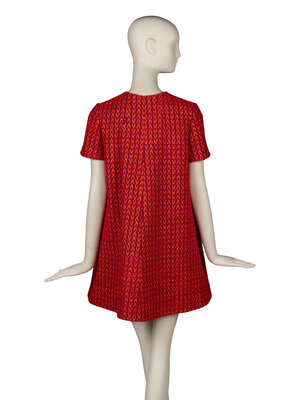 Short-sleeve, a-line dress in red/orange multi wool jacquard with "V" motifs throughout. Fully-lined with rear zipper closure.