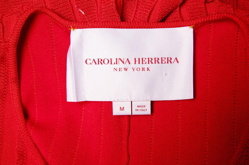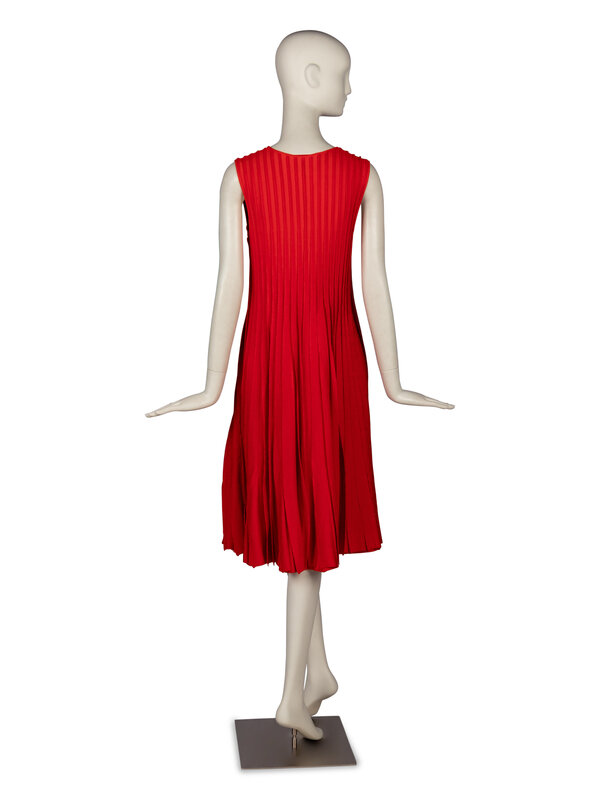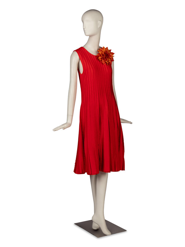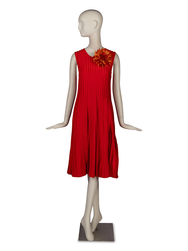 Sleeveless dress in variegated/horizontal knit rib with large floral brooch embellishment at chest. Unlined.