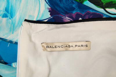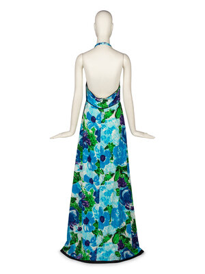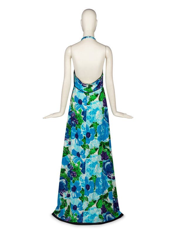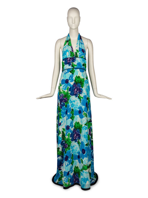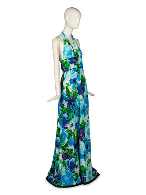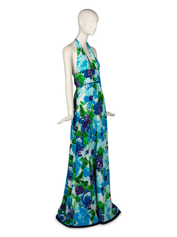 Halter dress in floral-printed silk with black silk satin trim at hem and bindings. Fully-lined with a rear zipper closure.