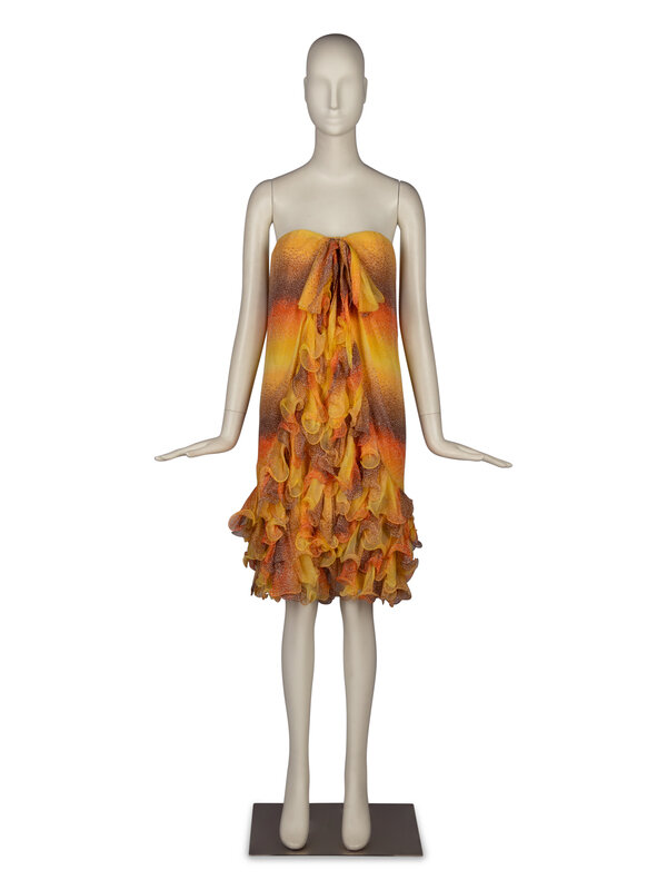 Sleeveless dress in pleated/gathered and printed silk chiffon with ruffle trim. Rear zipper closure with silk lining.