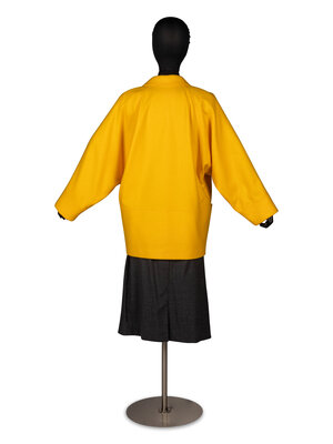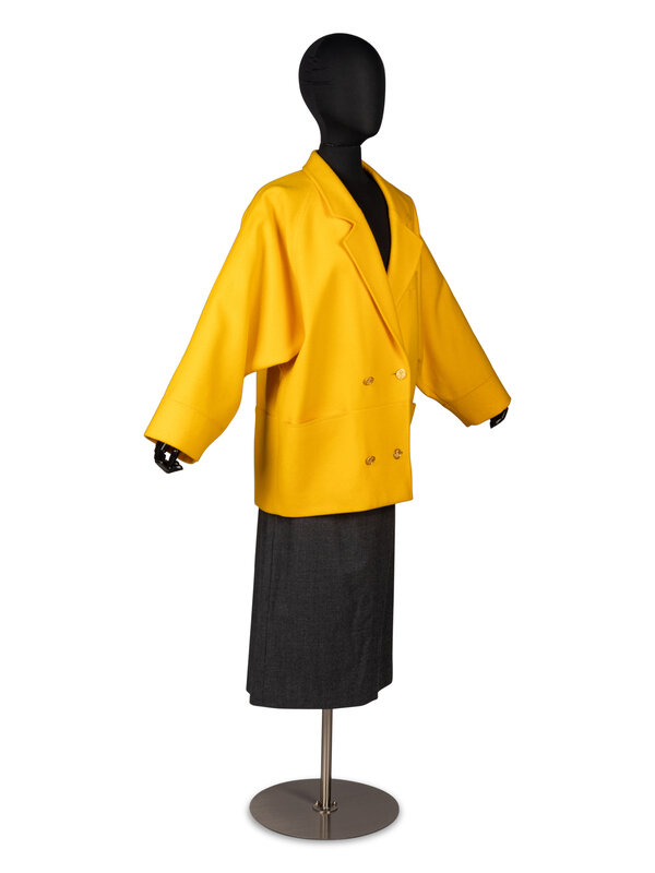 Wide, dropped-sleeve, double-breasted jacket in yellow wool. Jacket features notched collar, gold-tone metal buttons, full-lining, and two exterior pockets at hips.
