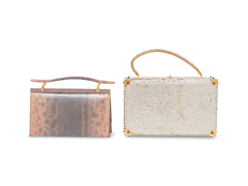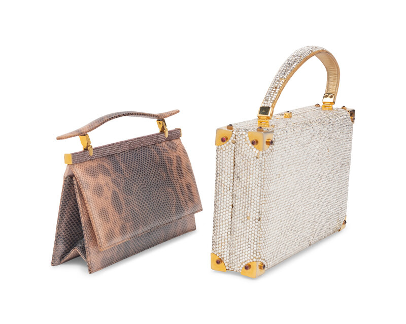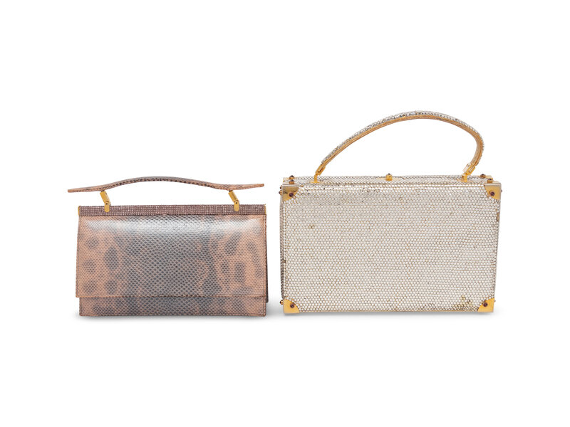 Rectangular, top-handle hard frame bag in crystal-embellished gold-tone metal hardware. Push-lock closure to opening with metallic gold, lambskin lining
