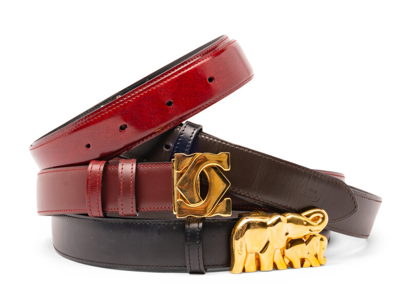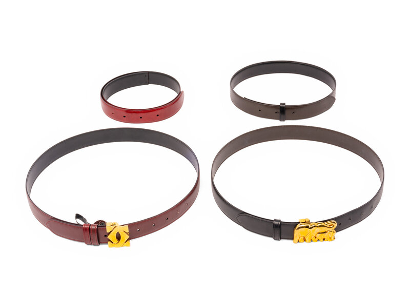 Reversible black-dark brown leather belt with a gold-tone metal buckle depicting mother elephant and calf.
