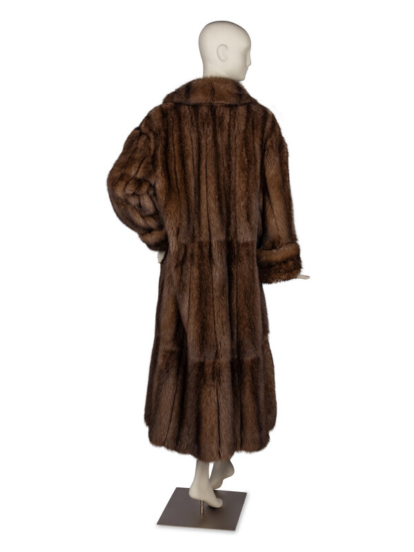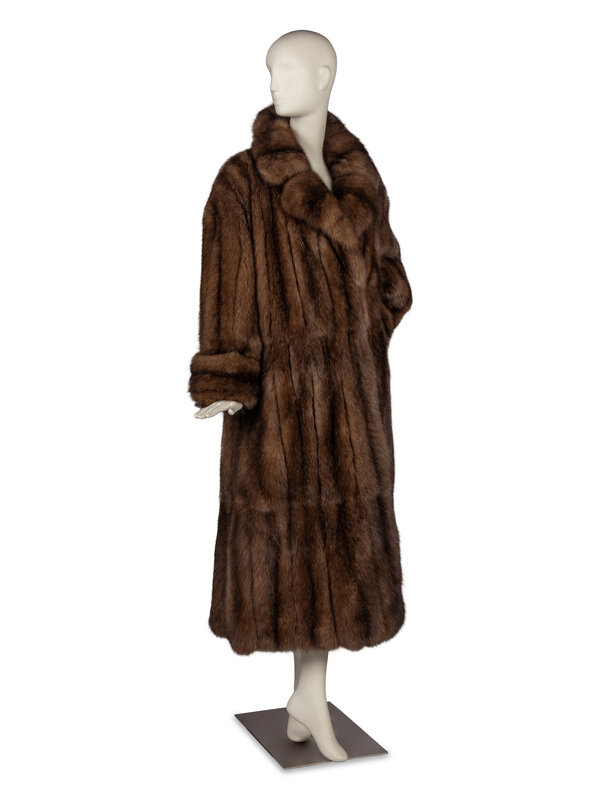 A full-length, Barguzinsky Russian sable fur coat. Coat features a notched collar, rolled-back cuffs, and jacquard lining. Locking hinge closures at center front with slash pockets at each hip.