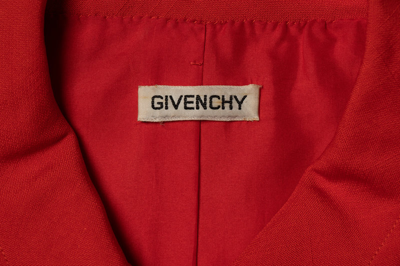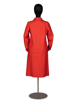 Button-front jacket in red cotton blend. Jacket features red enamel-covered button at front closure and cuffs with a full silk lining.