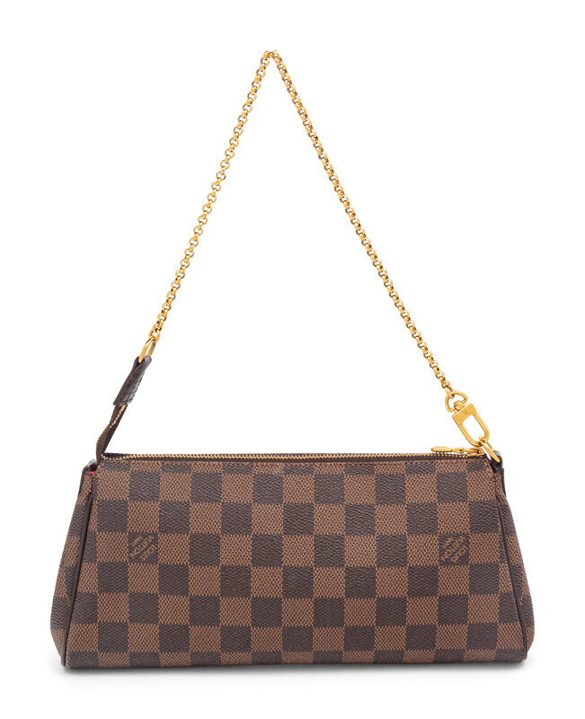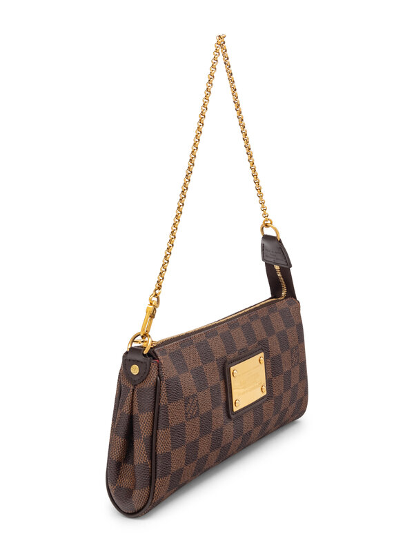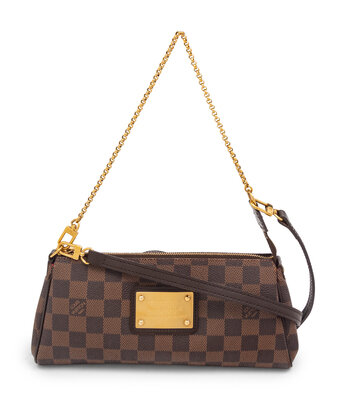 Louis Vuitton Eva Crossbody Pochette in Damier Ebene Canvas and Dark Brown Leather with Gold-Tone Hardware and Two Detachable Straps