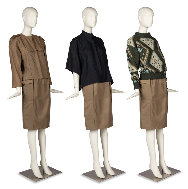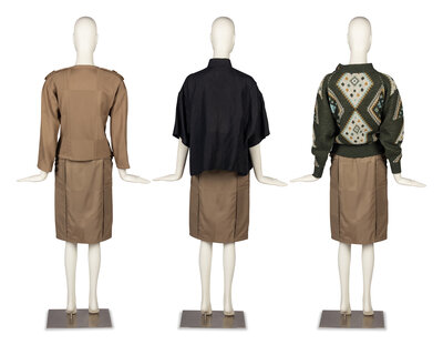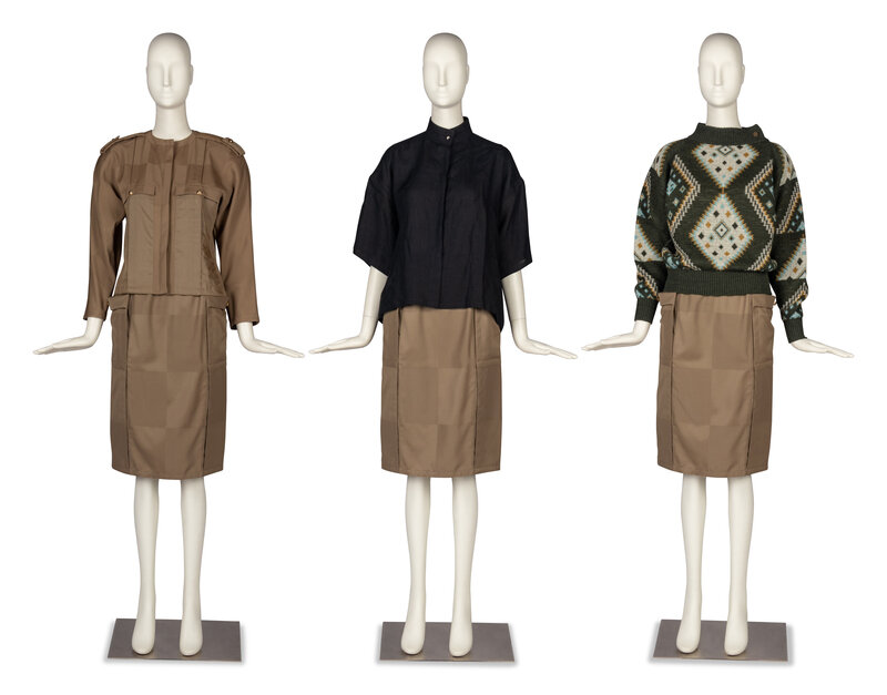 Long wool skirt in khaki. Side hook-and-eye and button closures. Two front patch pockets. Unlined. Includes black leather tie belt.