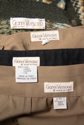 Collarless light wool jacket in khaki with shoulder pads. Two large front patch pockets. Concealed button placket. Unlined.