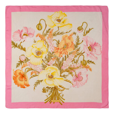 34" x 33.5" scarf in silk depicting Papavero-print floral bouquet. Hand-rolled and stitched edges. Made in Italy.