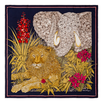 33" x 33.5" scarf in printed silk depicting floral lion and elephant, as well as flowers and foliage. Hand-rolled and stitched edges. Made in Italy.