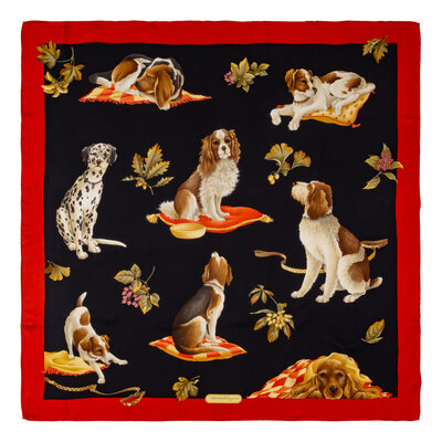 34.5" x 34" scarf in printed silk depicting dogs with botanical accents. Hand-rolled and stitched edges. Made in Italy.