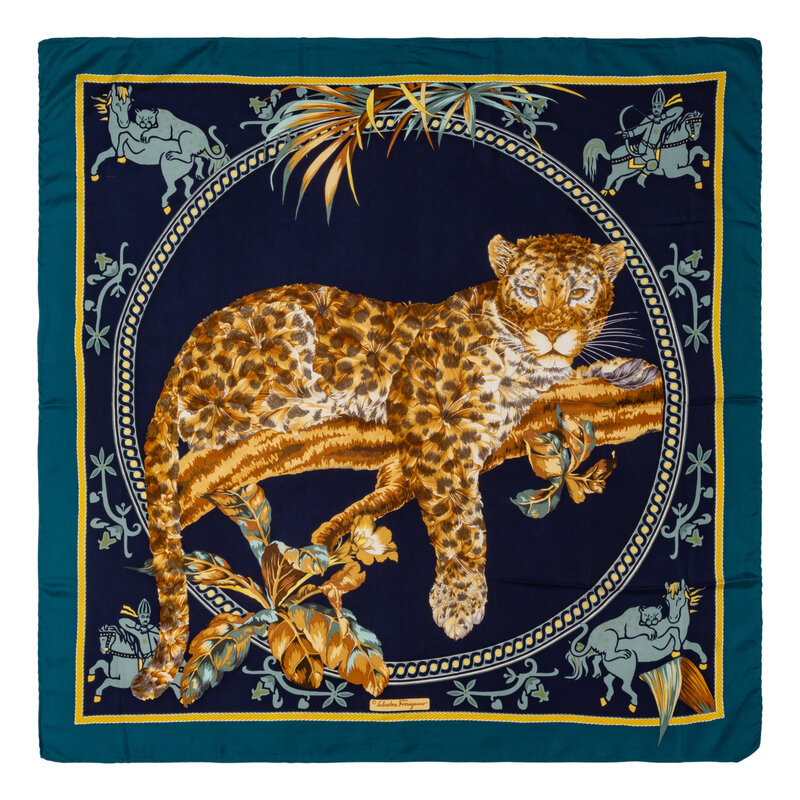 33" x 34" scarf in printed silk depicting floral leopard, horses, and archers. Hand-rolled and stitched edges. Made in Italy.
