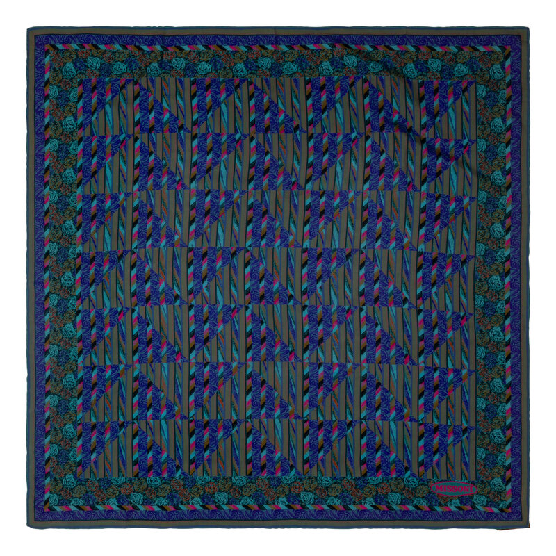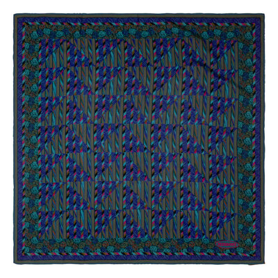 32.5" x 32" silk scarf in abstract, geometric print with floral motif. Hand-rolled and stitched edges. Made in Italy.