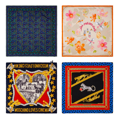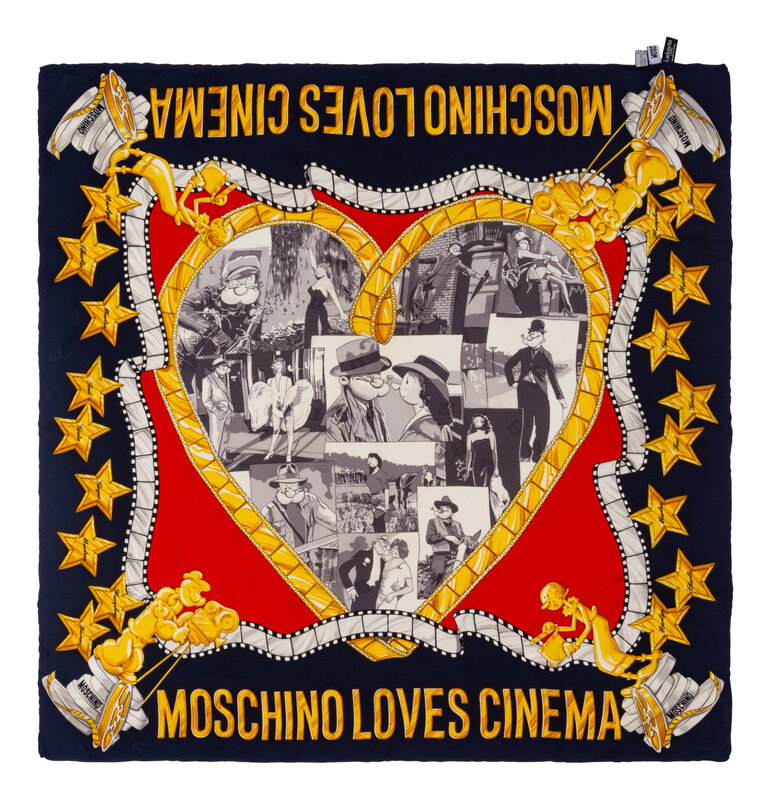 34" x 34" scarf in silk depicting "Moschino Loves Cinema" print with cartoons of Old Hollywood figures including Charlie Chaplin, Gene Kelly, Marlene Dietrich, and Marilyn Monroe. Hand-rolled and stitched edges. Made in Italy.