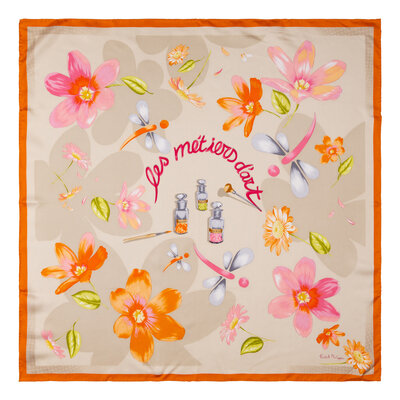 34" x 34" silk scarf in "Les Métiers d'Art" print depicting paintbrushes, paints, and flowers. Hand-rolled and stitched edges. Made in Italy.