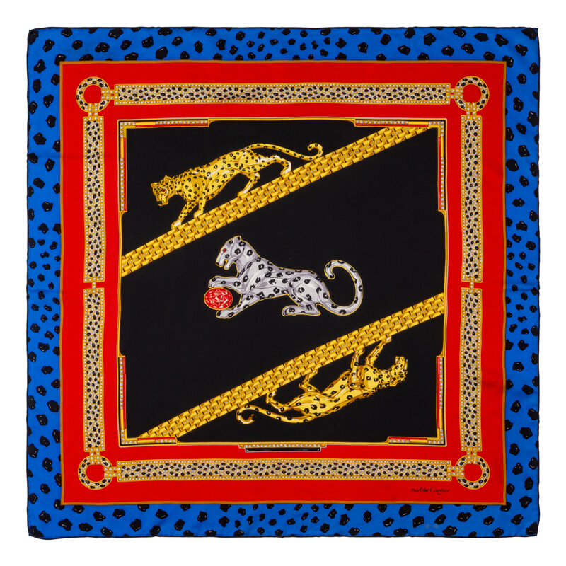 34" x 33.5" scarf in printed silk depicting Cartier Panthère with gemstone and precious metal motifs. Hand-rolled and stitched edges. Made in France.