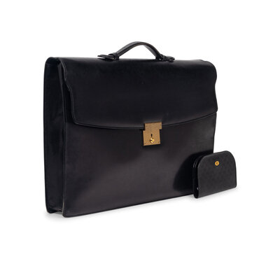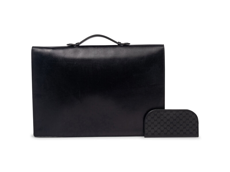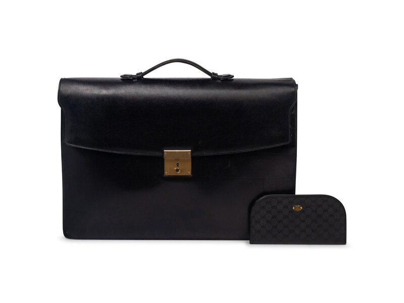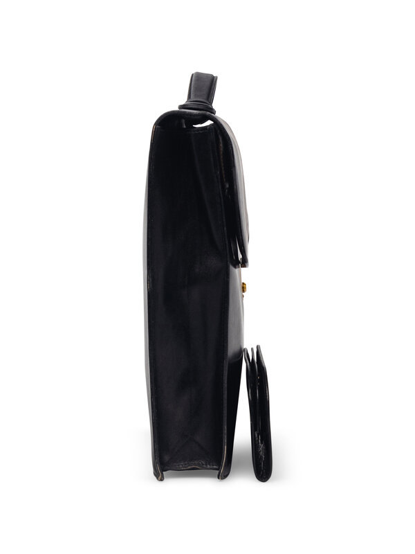 Top-handle briefcase in black calfskin leather with brushed gold-tone metal hardware.