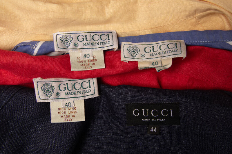 Long-sleeve linen button-down shirt in light yellow linen. Notch lapel. Brass-tone metal buttons with sun design. Patch pocket at chest.