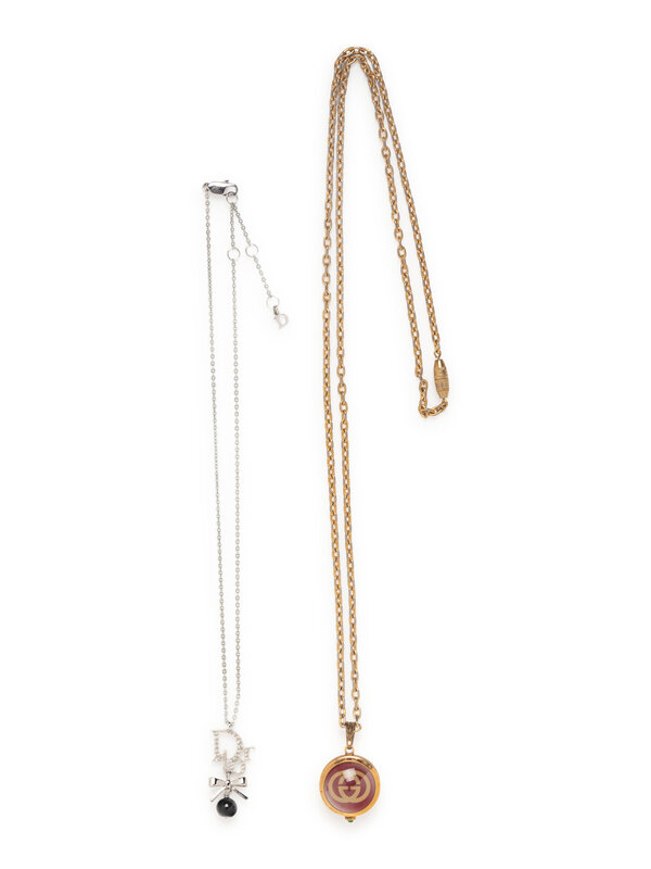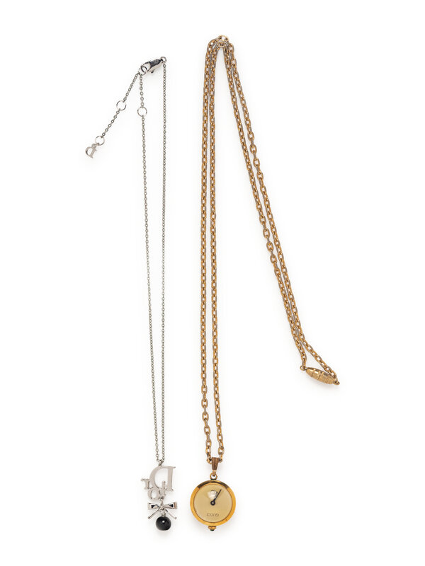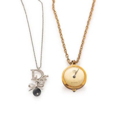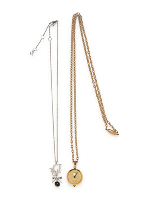 Spherical clock pendant with GG insignia motif backing. Chain with screw clasp. Brass.