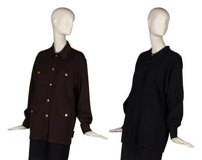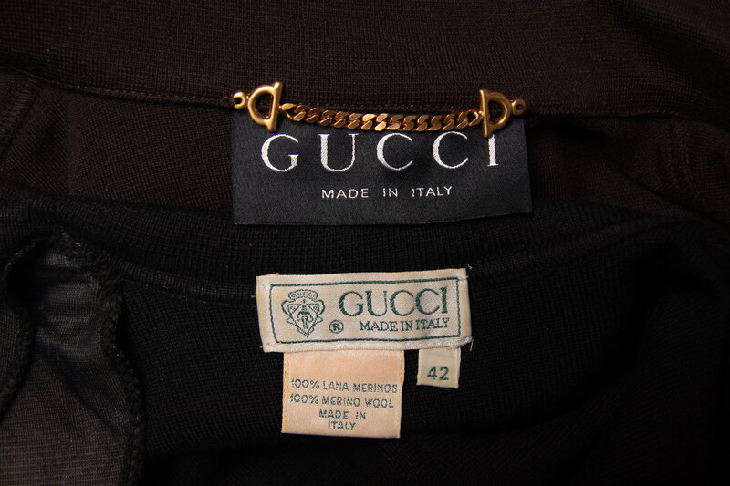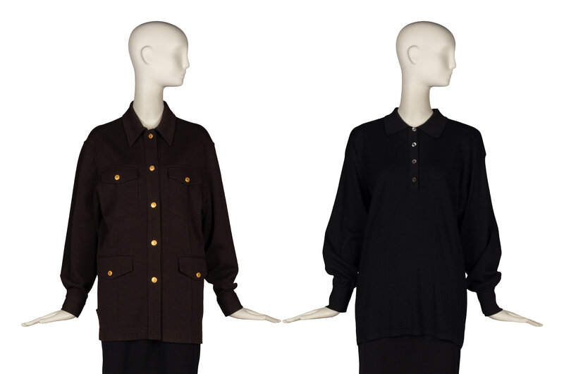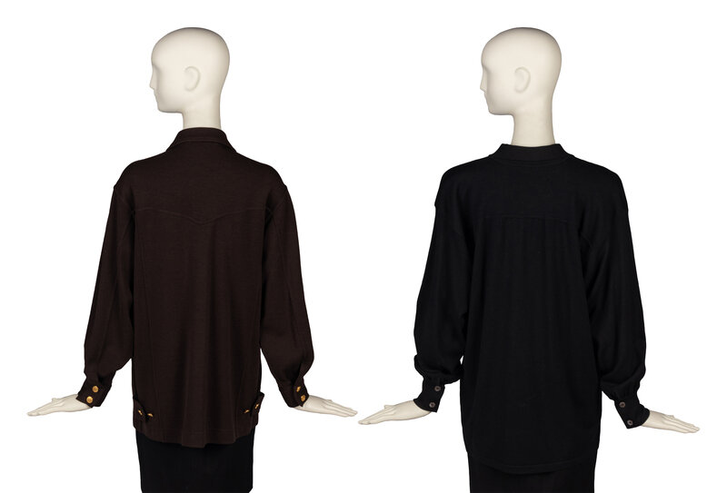 Longsleeve, button-front sweater in brown wool with gold-tone metal buttons. Sweater features four patch pockets and pointed shirt collar.