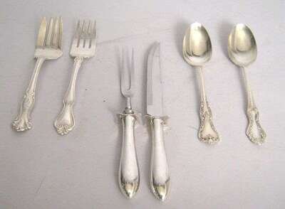 Comprising two meat forks, one monogramed "MTC", two spoons; together with a silver plate and stainless steel carving set. (6).