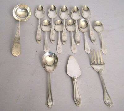 Comprising five tea spoons, five table spoons, one soup spoon; all monogramed "B"; together with various sterling and silver plate flatware items. (22 pieces total).