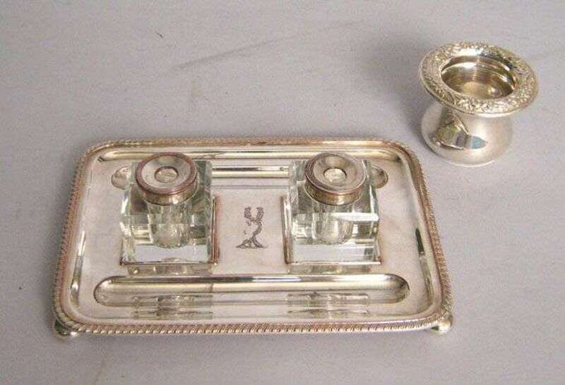 Together with a silver plated inkstand with two crystal inkwells, decorated with an engraved stag's head.