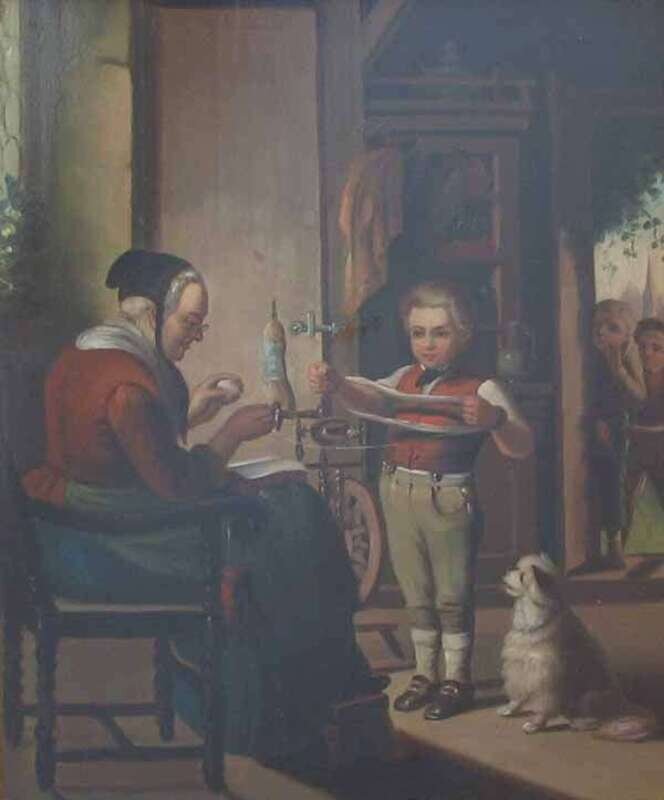 NORTHERN EUROPEAN SCHOOL (19TH CENTURY)TWO OILS GRANDMOTHER WITH GRANDSON WINDING YARN
