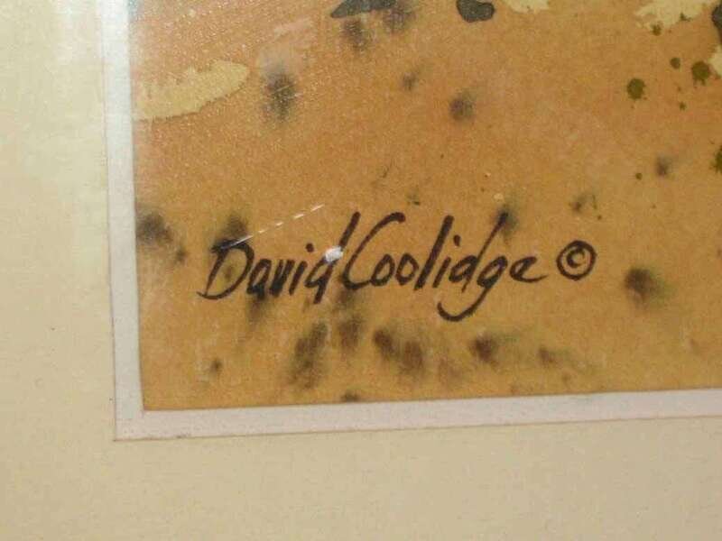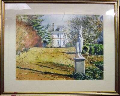 Landscape with house and garden statue in foreground. Signed bottom left, watercolor on paper