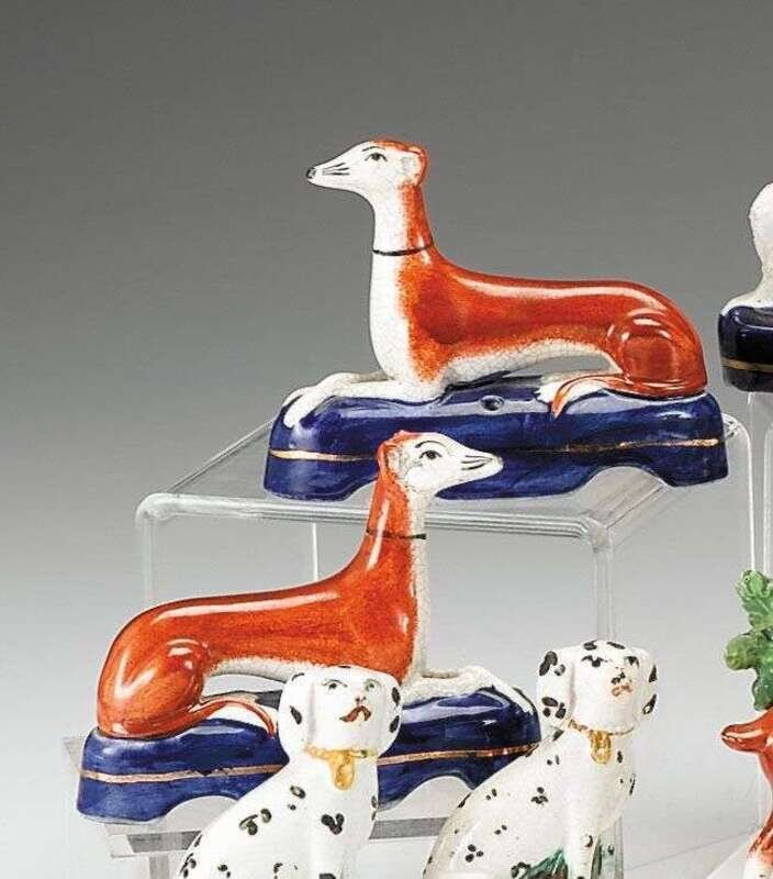 Pair of reproduction Staffordshire pen holders in the shape of Greyhounds mid-19th century