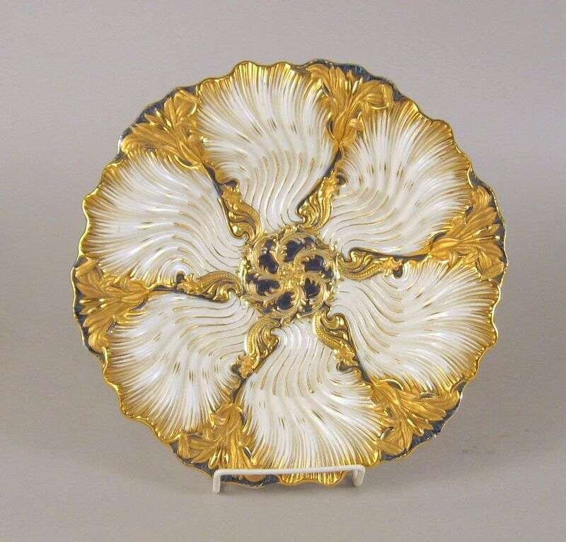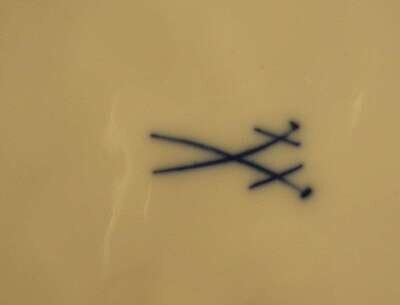 Decorated with cobalt, white and gilt decoration; crossed sword mark to reverse.