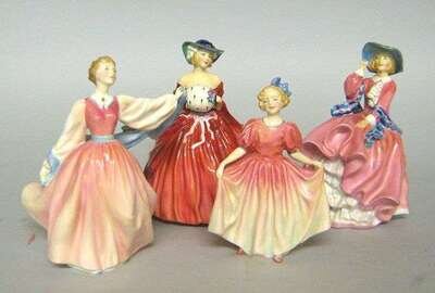 Four porcelain figures modeled as women with titles including "Gay Morning" (H: 7 1/2 in.), "Genevieve" (H: 8 in.), "Sweeting" (6 1/2 in.), and "Top O' the Hill" (7 1/4 in.), all marked on the underside. (4).