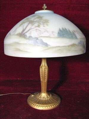 Reverse painted glass lampshade and gilt metal lamp base 20th century
