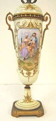 Decorated with a reserve of a courting couple, with gilt metal mounts; now mounted as a lamp.