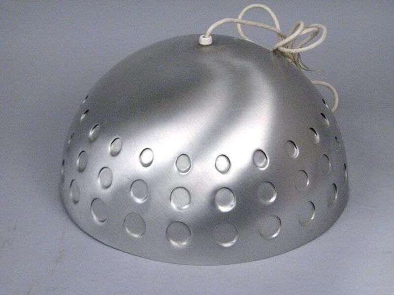 Of domed form in brushed chrome, decorated with three rows of graduated impressed circles around rim.