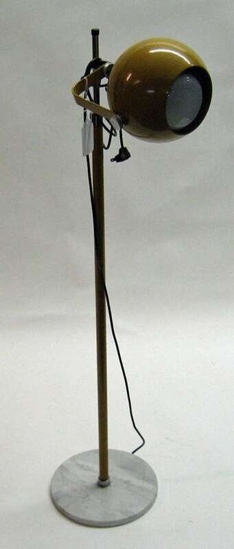 Lamp with large circular bulb encased with yellow aluminum. All atop a circular marble base.