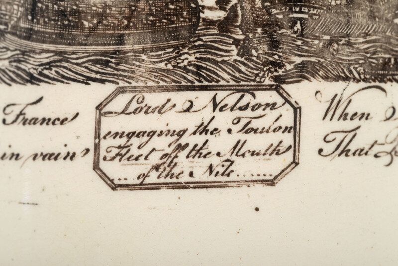 printed with a view of ships in action representing the Battle of the Nile in 1798, with narrative text reading, Lord Nelson Engaging the Toulon Fleet of the Mouths of the Nile and The young Alexander of France / May boast of his prowess in vain / When Nelson appears tis contest / That Britons are Lords of the Main.