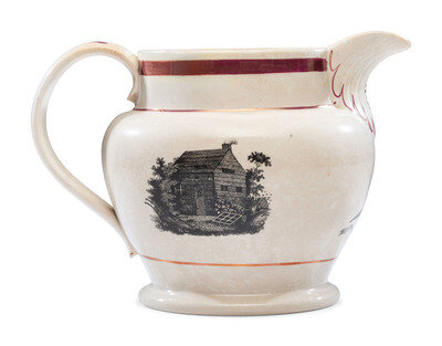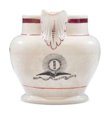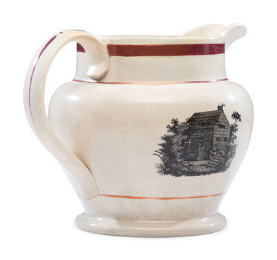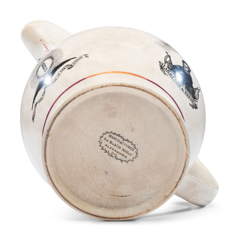 one side with transfer portrait of William Henry Harrison and text reading, Our Country's Hope above and Harrison & Reform below; the opposite with log cabin imagery. On the other side is the classic log cabin design, with lustre band and highlights to rim, spout, and handle.