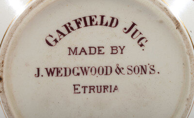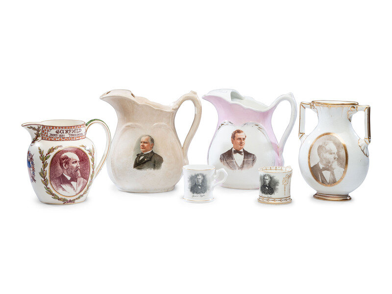 comprising two pitchers with color transfers, one depicting William Jennings Bryan, and the second William McKinley; a James Garfield photographic transfer vase; one James Garfield presidential election pitcher by Wedgwood and Sons, England; and two Zachary Taylor mugs, one with additional portrait of George Washington.