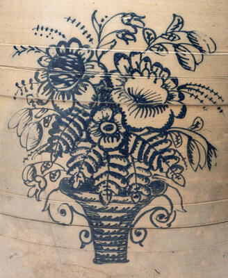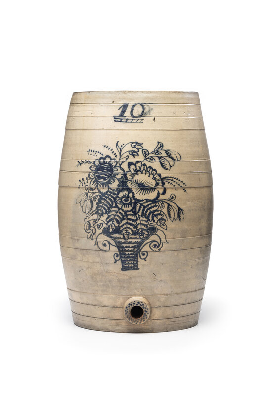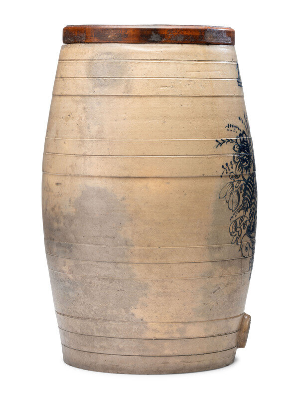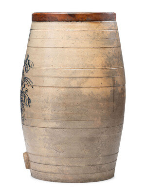 A Ten-Gallon Stoneware Keg with Floral Basket Decoration