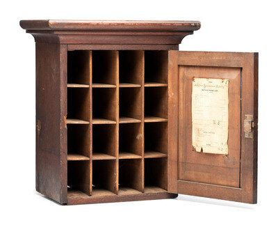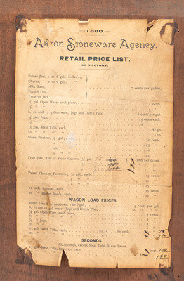 having an interior fitted for receipts, the door mounted with a price list circa 1886 from the Akron Stoneware Agency.