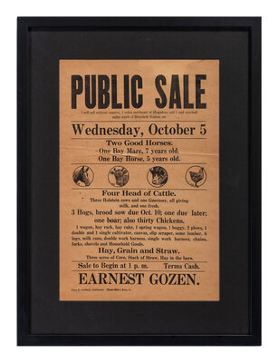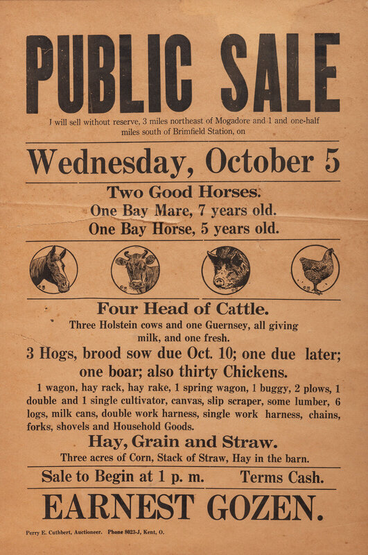 promoting a livestock auction of lots including two good horses and a brood sow due Oct. 10, and three acres of Corn, stack of Straw, and Hay in the barn.