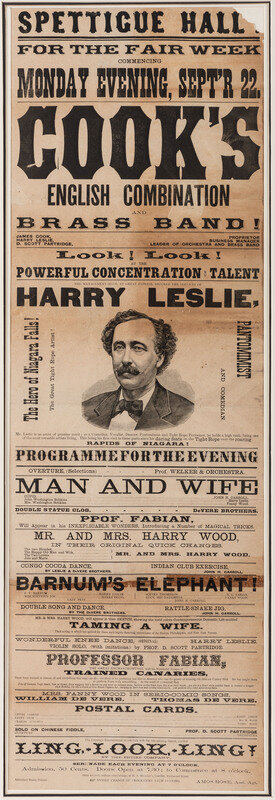 promotes the band's upcoming appearance at Spettigue Hall, along with Harry Leslie, a gymnast and daredevil, more commonly known as the "American Blondin" or the "Hero of Niagara Falls" for his daring tightrope walk across the Niagara Gorge on June 15, 1865.