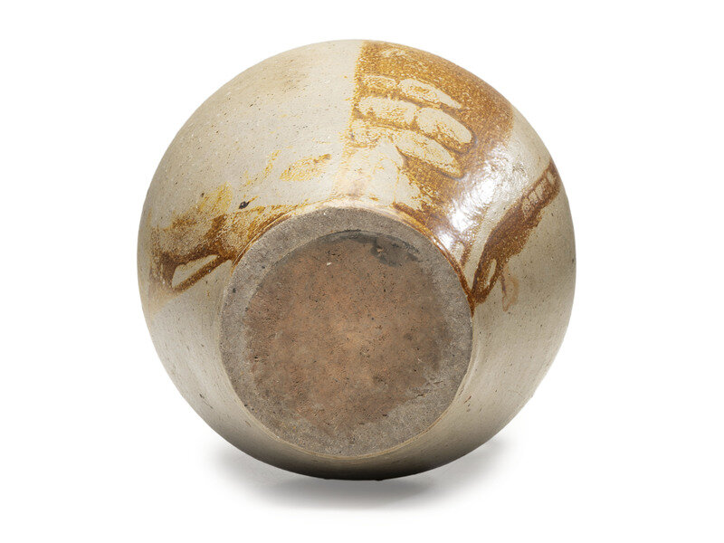 with tooled shoulder and mouth rim and fingerprints present to glaze of lower body; otherwise unmarked.